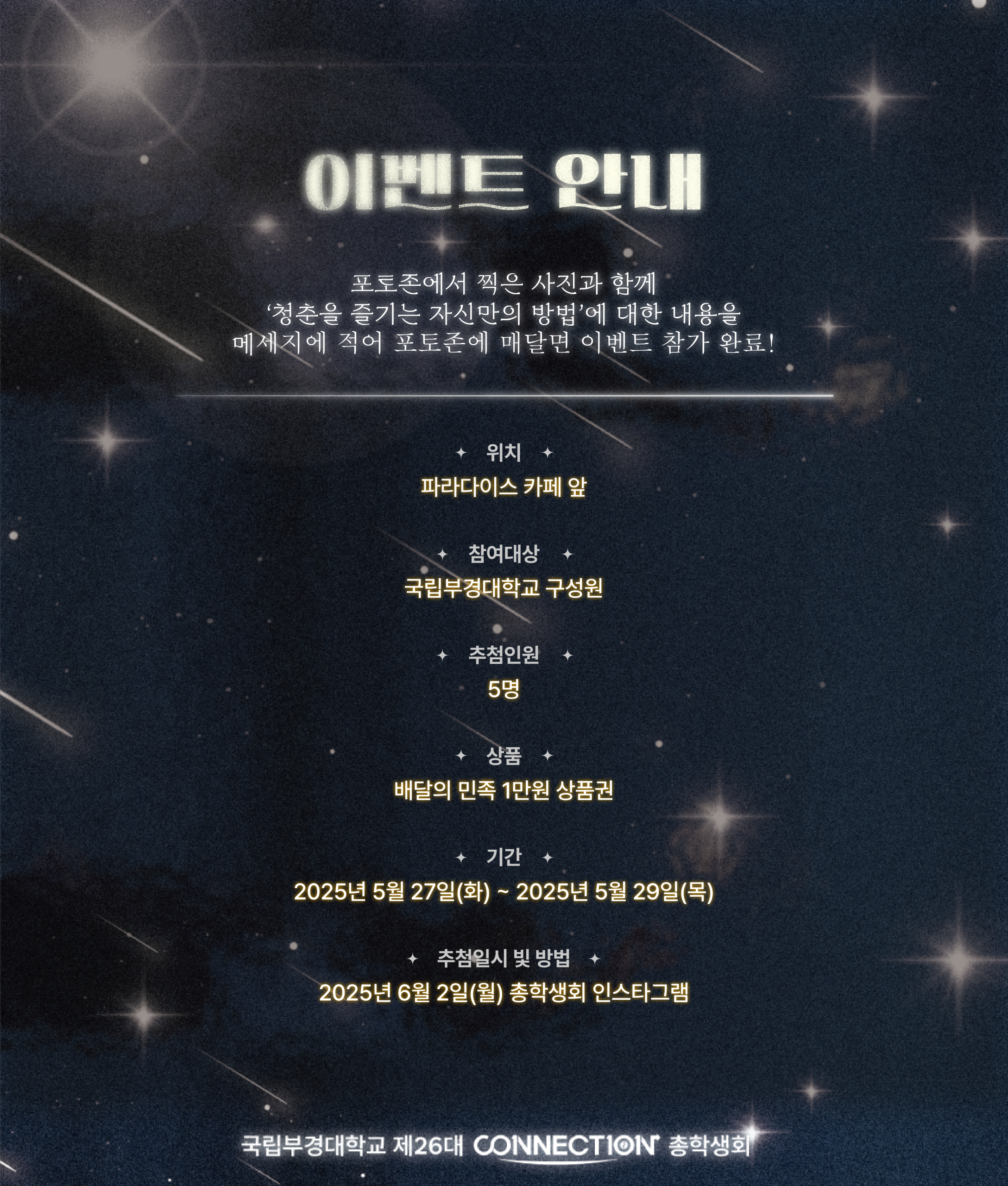 •참여방법 : 포토존에서 찍은 사진과 함께 '청춘을 즐기는 자신만의 방법'에 대한 답을 메시지에 적어 포토존에 매달면 이벤트 참가 완료!